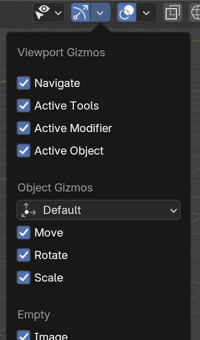 - Viewport Gizmo 툴에서 “Object Gizmos”의 Move/Rotate/Scale 체크하면 툴 선택과 관계없이 항상 트랜스폼 기즈모가 표시됨